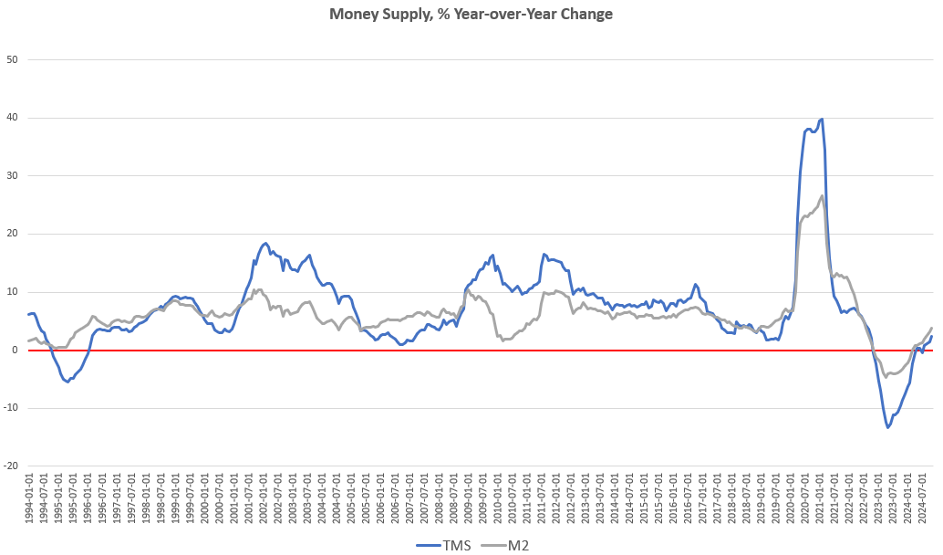In recent months, M2 growth rates have followed a similar course to TMS growth rates, although M2 is growing faster than TMS. In November, the M2 growth rate was 3.73 percent. That’s up from October’s growth rate of 3.13 percent. November’s growth rate was also up from November 2023’s rate of negative 3.27 percent. Month over month, M2 increased by 0.94 percent from October to November. That’s the largest month-to-month growth rate in nine months.